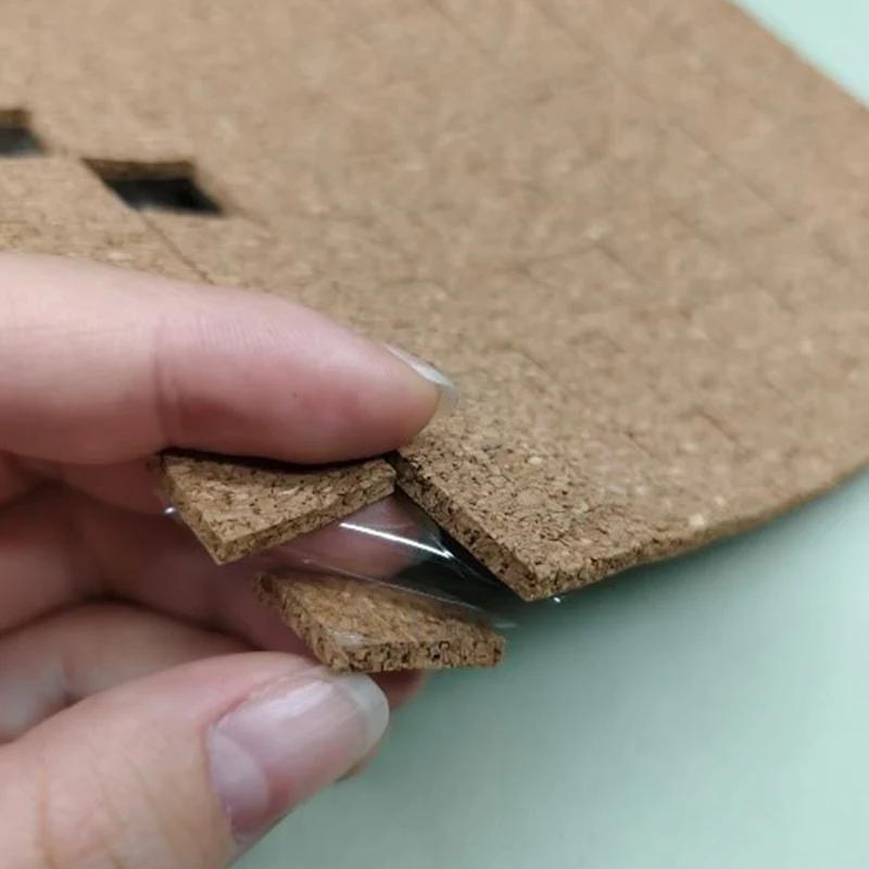 1/8" x 3/4" x 3/4" கார்க் ஷிப்பிங் பேட்கள் க்ளிங் பேக்கிங், முக்கியமாக கார்க் மற்றும் நீக்கக்கூடிய பசை ஆகியவற்றால் ஆனது, மேலும் காகிதம் அல்லது வெளிப்படையான PET பின் லைனராக, தாள்கள் அல்லது ரோல்களின் வடிவத்தில் பெட்டியில் நிரம்பியுள்ளது, கீழே காட்டப்பட்டுள்ளது: